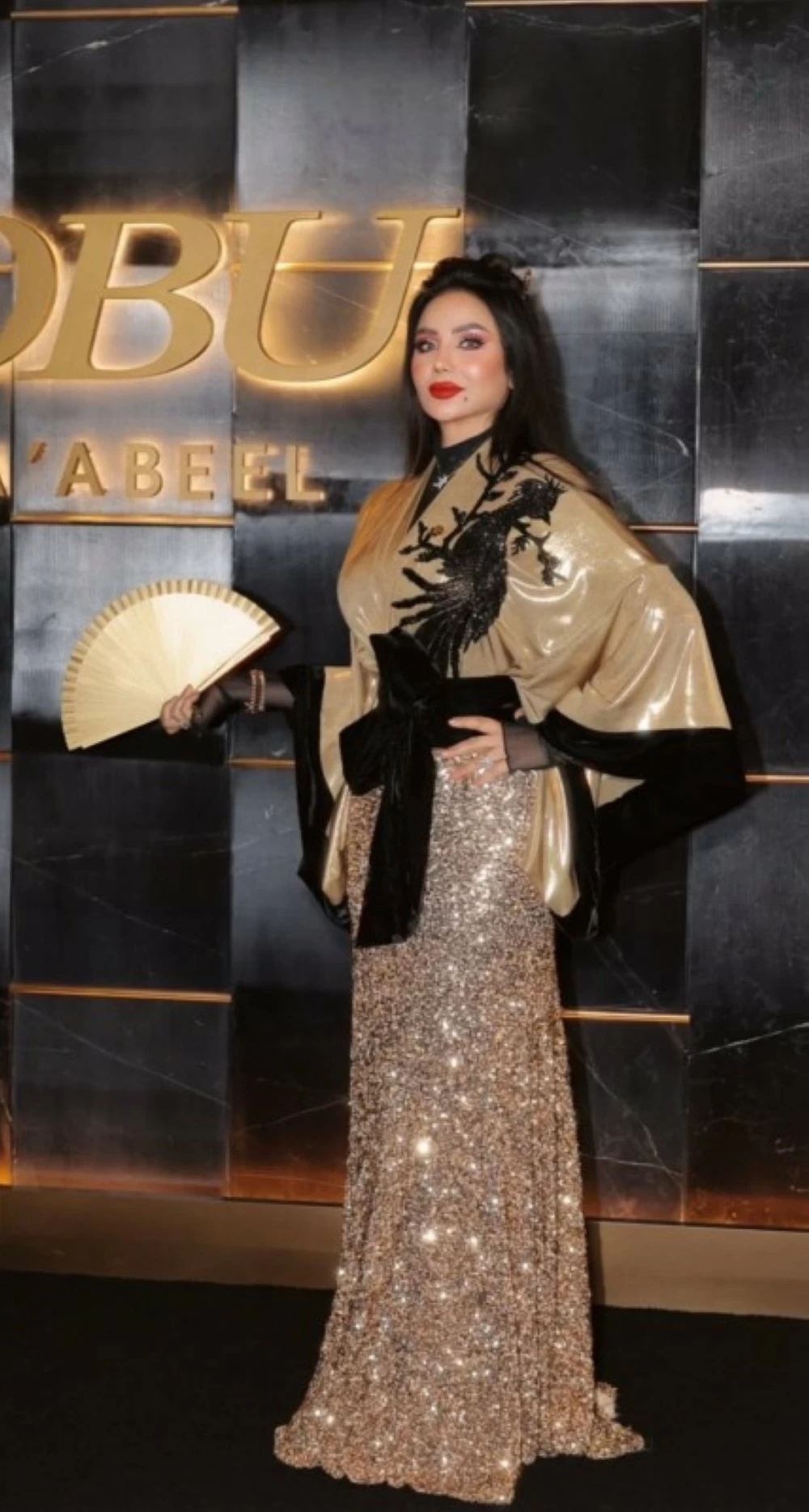 التصميم اعتمد على خطوط واضحة وهيكلية مستوحاة من الأزياء اليابانية التقليدية، مع معالجة عصرية في القصّة والتنفيذ، ما منح الإطلالة حضوراً قوياً دون مبالغة. اختيار الألوان جاء موفقاً، وخلق تبايناً أنيقاً بين الذهبي اللامع والأسود الكلاسيكي، في انسجام يعكس حرفية عالية في التصميم.