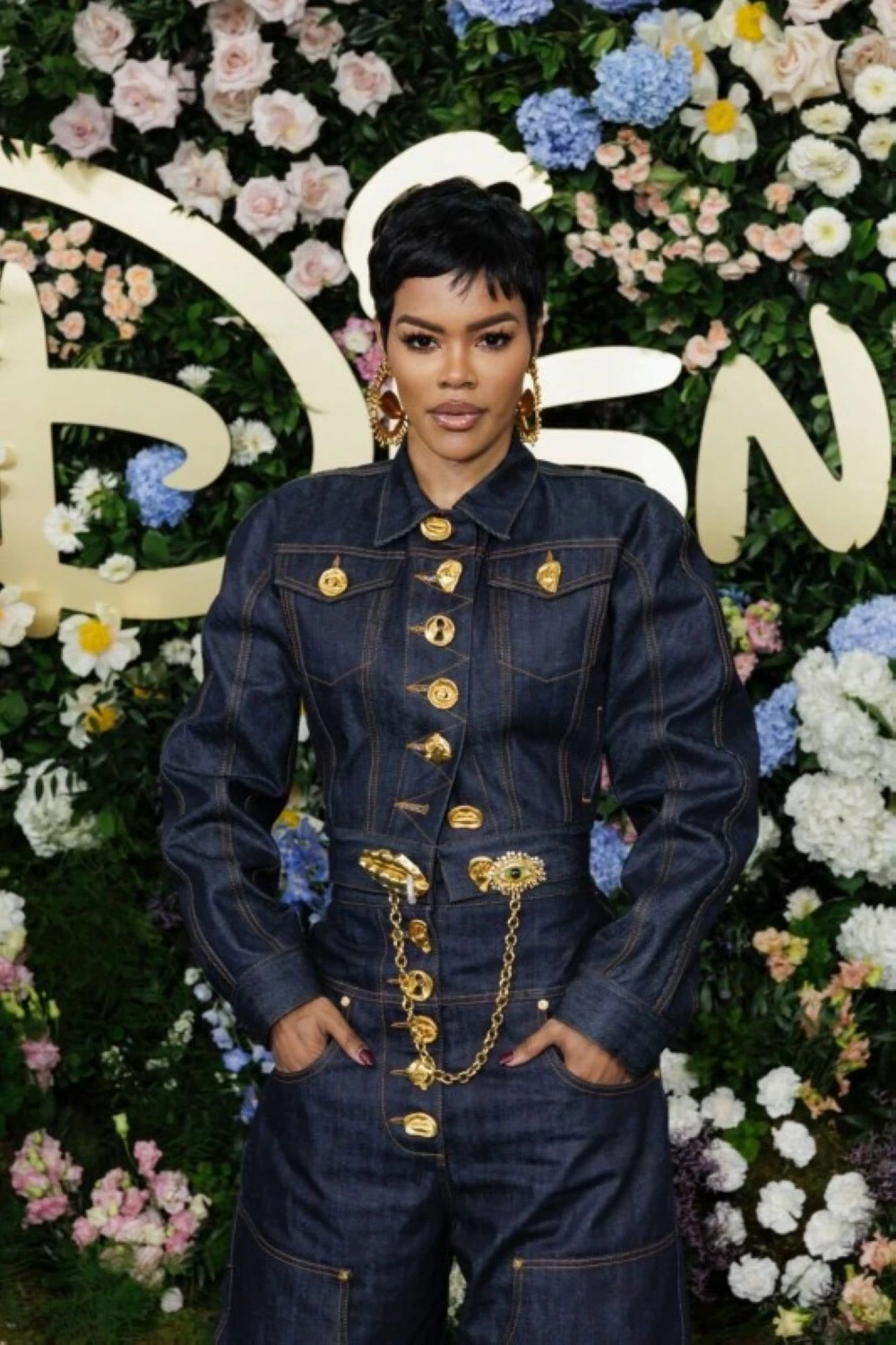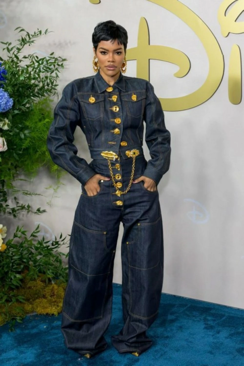 The distinctive gold accessories added a luxurious dimension to the look, as they helped break the practical nature of denim and transform it into an elegant option suitable for formal appearances and notable events. The harmony between the denim color and the metallic accessories emphasized Teyana Taylor's ability to smartly blend classic elements with modern touches, in a look that reflects high confidence and a strong presence on the red carpet or in media appearances.