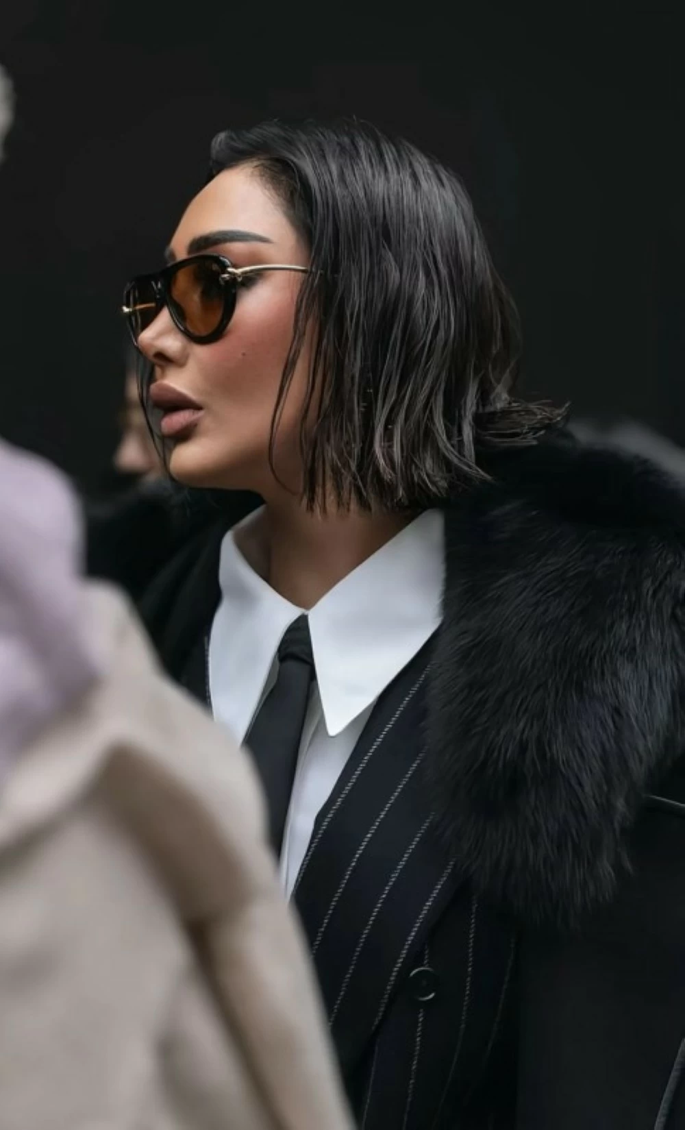اختارت ريم بدلة رسمية سوداء مخططة، جاءت بقصّة دقيقة تمزج بين الكلاسيكية والجرأة العصرية، ونسّقتها مع قميص بياقة بارزة منح الإطلالة قوة وأناقة واضحة. وزادت ربطة العنق السوداء وقفازات الجلد من فخامة اللوك، لتؤكد استلهامها لأناقة الأزياء الرجالية بروح عصرية تحمل توقيعها الخاص.