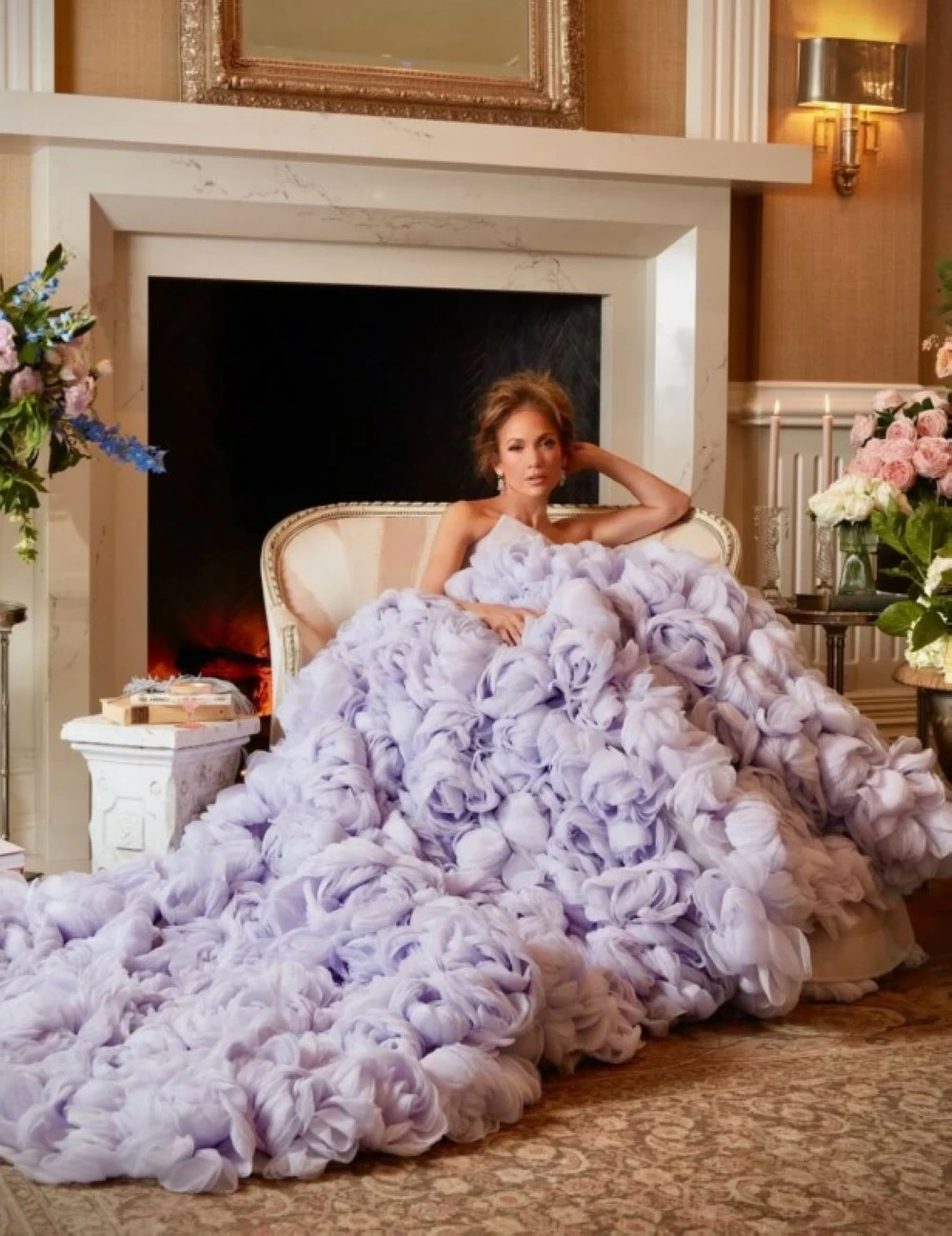The American actress Jennifer Lopez made a stunning appearance in an elegant lilac dress, which caught attention with its design adorned with large, prominent floral embroideries that covered wide areas of the dress, clearly inspired by the classic romantic vibes famous in the series Bridgerton. The design came with a dreamy spirit that combines aristocratic luxury with soft femininity, along with a contemporary touch that reflects Lopez's bold identity and her enduring ability to reinterpret classic styles in a modern way.