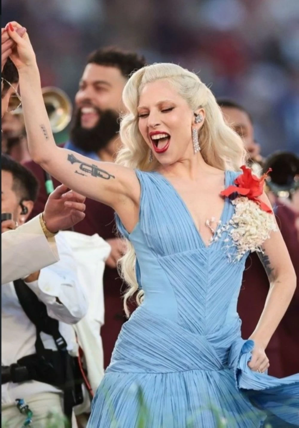 أطلت النجمة العالمية ليدي غاغا خلال عرض السوبر بول بإطلالة لافتة جمعت بين الجرأة الفنية والحس المسرحي المعروف عنها، واختارت فستاناً باللون السماوي بقصة إسبانية واضحة، عكست روح الفلامنغو والدراما اللاتينية بأسلوب معاصر. تميّز الفستان بتصميمه الأنثوي المتحرك، وزُيّن بوردة حمراء بارزة أضفت لمسة درامية قوية وكأنها نقطة ارتكاز بصرية للإطلالة كاملة.