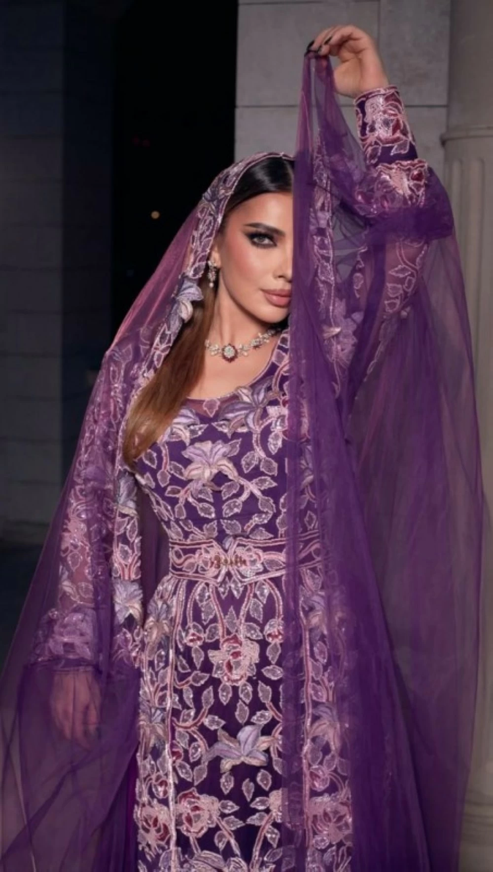 In her latest appearance, Assala Nasri presented a rich visual scene that blends traditional elegance with contemporary taste, as she chose a long gown in royal purple, adorned with dense embroidery featuring intricate floral patterns that extended across the entire design, giving the look a striking visual depth and theatrical presence. The silhouette was soft and feminine, highlighting the figure without exaggeration, with a defined waist belt that enhanced the balance between luxury and grace.