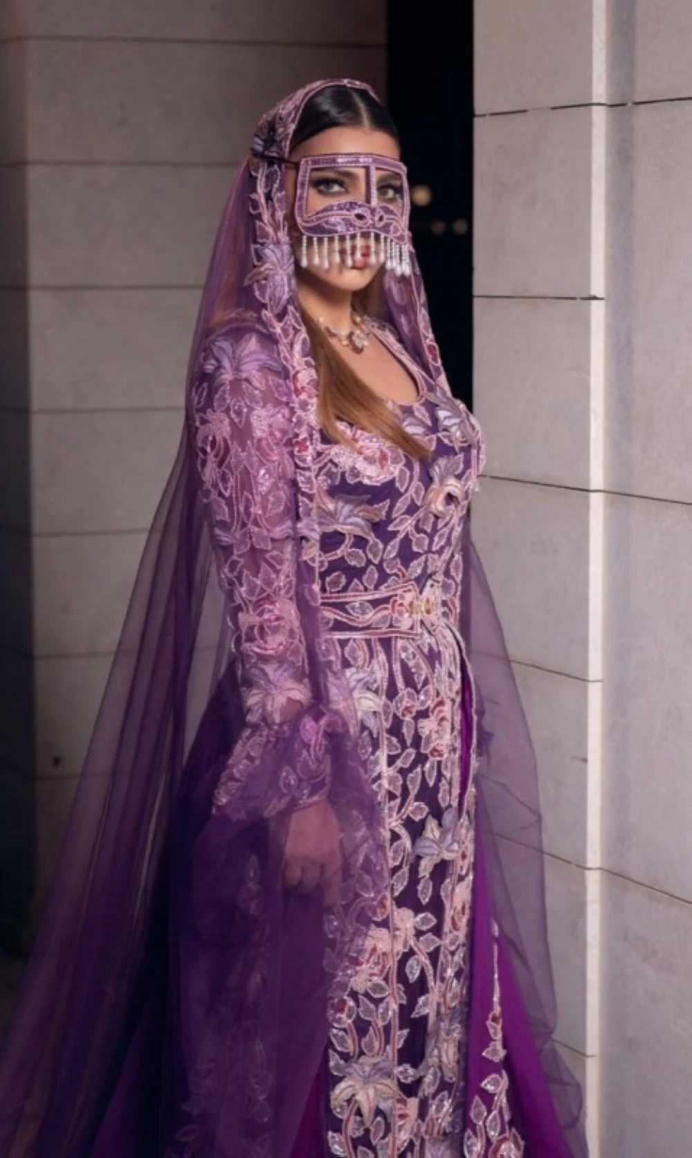 العنصر الأبرز كان غطاء الوجه المستوحى من البرقع التقليدي، والمطرّز بعناية مع خيوط متدلّية أضافت بعدًا احتفاليًا ودراميًا، في إشارة ذكية إلى الجذور الثقافية الخليجية بأسلوب مُحدّث. الطرحة الشفافة المنسدلة أكملت المشهد، ومنحت الحركة خفة تُخفف من كثافة التطريز، بينما حافظت على وقار الإطلالة.