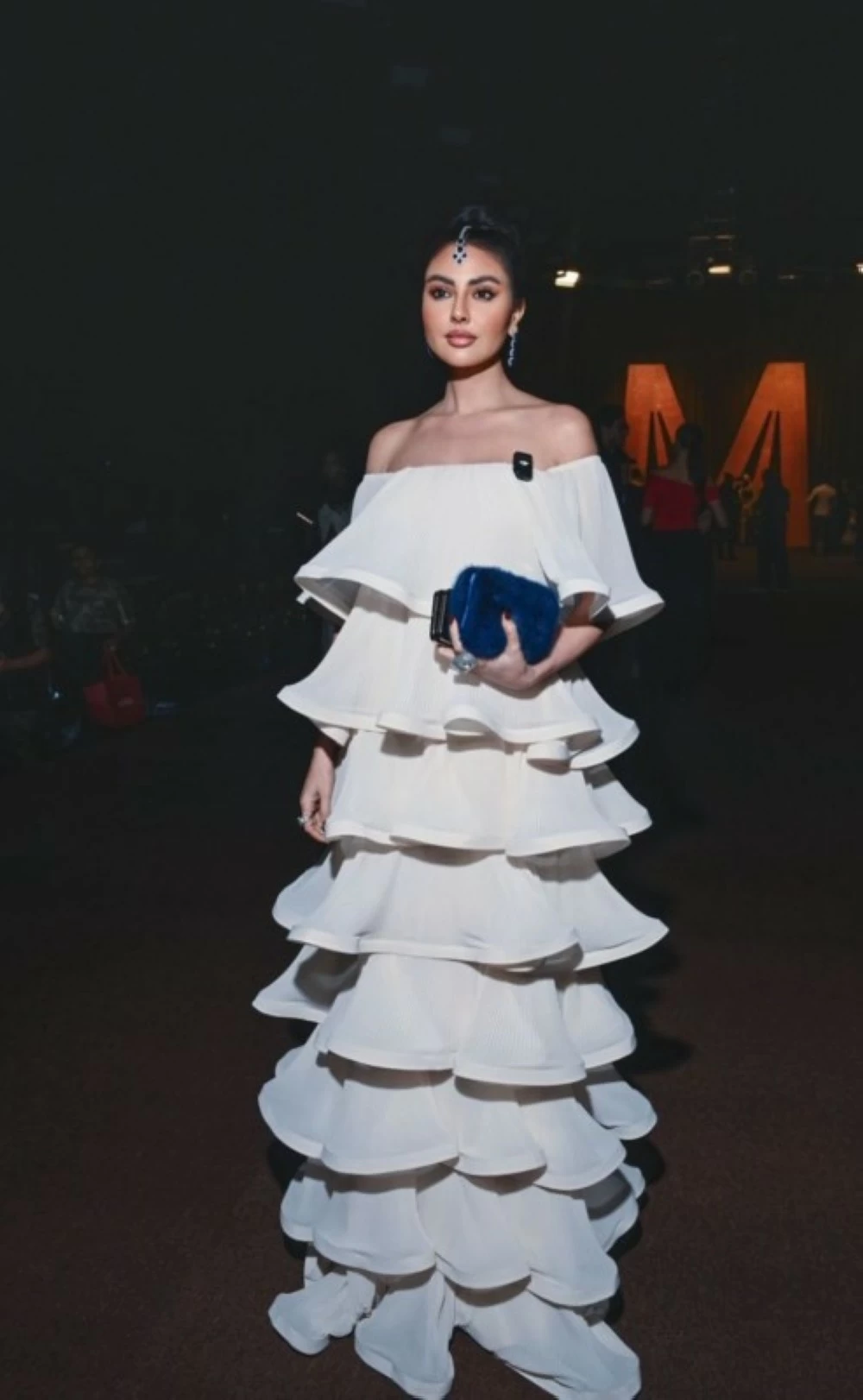 In her latest appearance, Maryam Hussein chose a look characterized by dreamy romance with a clear dramatic touch, as she wore a long white dress with a layered design that gave her a striking feminine presence. The fluidity of the fabric and the gradient of the layers added a soft movement to the look, while the off-shoulder design highlighted the beauty of the neck and the elegance of the collarbone in a delicate and unpretentious manner.