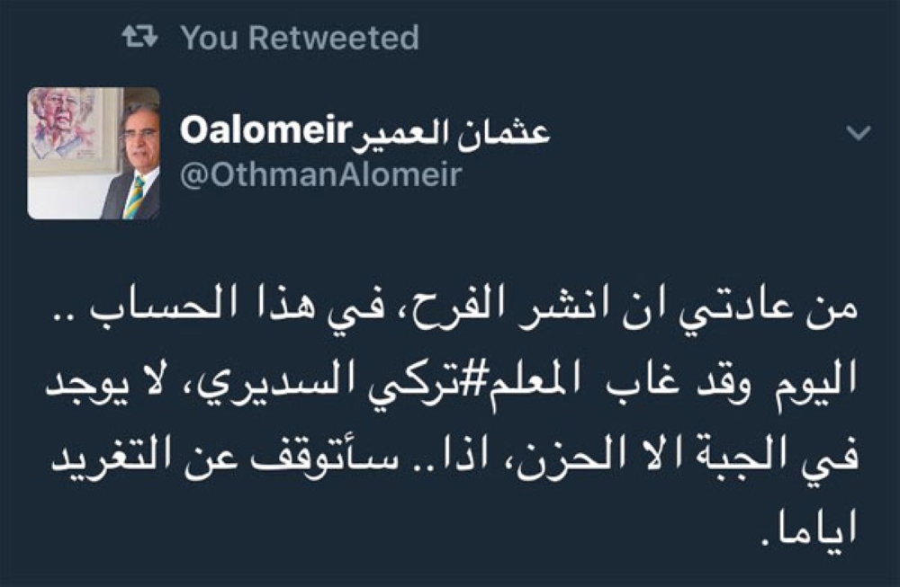 وقال العمير في تغريدة له عبر حسابه في تويتر: من عادتي أن أنشر الفرح في هذا الحساب.. اليوم وقد غاب المعلم تركي السديري، لا يوجد في الجبة إلا الحزن، إذا.. سأتوقف عن التغريد أياما.