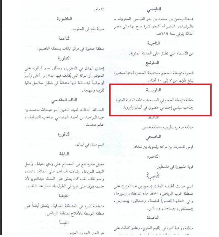 وفي ذات السياق، أثيرت تساؤلات حول شارع يحمل اسم «النازية»، فاتضح بحسب ما جاء في الجزء الأول من «معجم أسماء الشوارع» (صفحة 504) أنه يرمز لاسم منطقة في المسيجيد بمنطقة المدينة المنورة، وهو ما يتسق مع منهجيات تسمية الشوارع التي تعتمد ضمن مصادر التسميات أسماء المعالم والمناطق الجغرافية، وأضيف في المعجم بأن مسمى «النازية» يعود أيضاً إلى «حزب سياسي عنصري في ألمانيا وأوروبا»، ولم تقدم لجان الخبراء التي أعدت المعجم تفاصيل أكثر حول أسباب تلك التسمية ومعنى اللفظ، وهو أمر بحاجة إلى المزيد من التفاصيل وربما كان من الأفضل أن تتجنب أمانات المدن اختيار بعض هذه التسميات من المعجم ومراعاة ما قد تحدثه من لبس، وهذا بالإضافة إلى عدم وجود معلومات كافية حول تلك المناطق الجغرافية وأسباب التسمية.