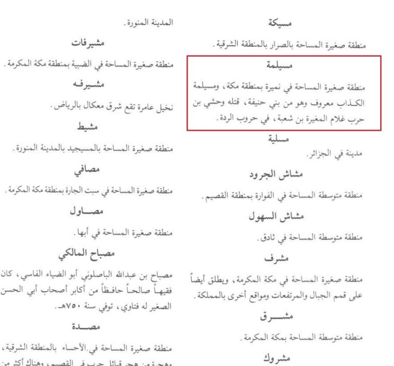 من الممكن تفهم أن بعض الأسماء طرأت حولها مستجدات في أزمان لاحقة أو تكشفت عنها حقائق تاريخية لم تكن معروفة في السابق، فحينها تقوم الجهات المعنية بإزالة أسمائها، وهذا الأمر واقع نشاهده في جميع أنحاء العالم، ولكن كان مثيراً للدهشة والجدل وجود شوارع تحمل اسم «مسيلمة» و«أبرهة الحبشي» في الأحساء، فالمعروف لدى العامة أن اسم مسيلمة مرتبط بمسيلمة الكذاب الذي ادعى النبوة في زمن النبي محمد صلى الله عليه وسلم، وأبرهة الحبشي الذي حاول هدم الكعبة، والأرجح أنه ليس من السهل وقوع خطأ فادح من هذا النوع، إلا أن المتحدث السابق باسم وزارة الشؤون البلدية والقروية، أوضح في تصريحات لإحدى الوسائل الإعلامية في العام 2013، أن «أبرهة الحبشي» المقصود في لافتة اسم الشارع هو صحابي، وليس من شابهه بالاسم الذي حاول هدم الكعبة، و«مسيلمة» -على حد قوله- يقصد به أحد الصحابة، ولا يقصد به «مسيلمة الكذاب»، ولكن من الواضح أن المتحدث باسم وزارة الشؤون البلدية أخطأ في ذلك الحين، إذ لا يوجد صحابي اسمه مسيلمة وإنما المؤكد وفقاً للمرجع المعتمد في الوزارة (معجم أسماء الشوارع والميادين)، فإن المقصود بـ«مسيلمة» هي منطقة صغيرة المساحة في نميرة بمنطقة مكة المكرمة، وذلك بحسب ما هو موضح في الجزء الثاني من المعجم (صفحة 988)، وفي جميع الأحوال لا يقصد بها مسيلمة الكذاب.