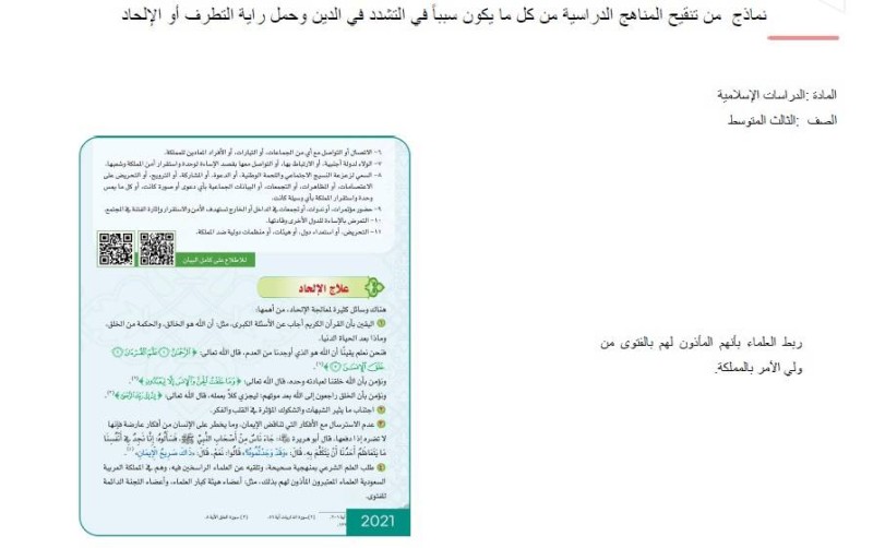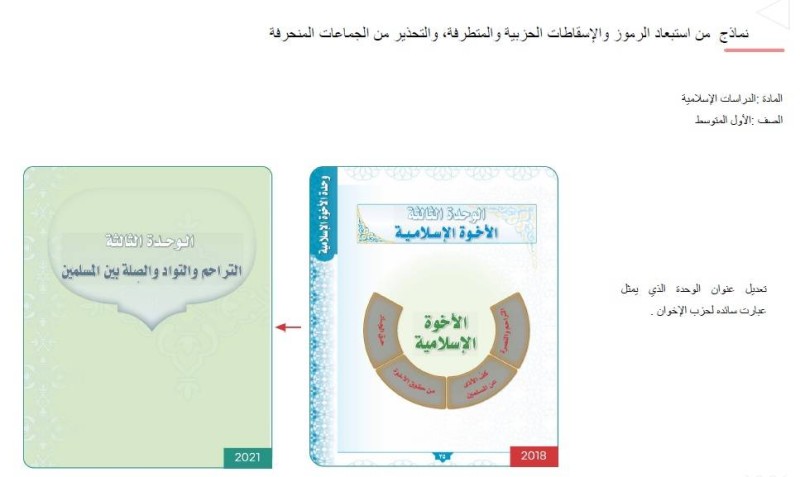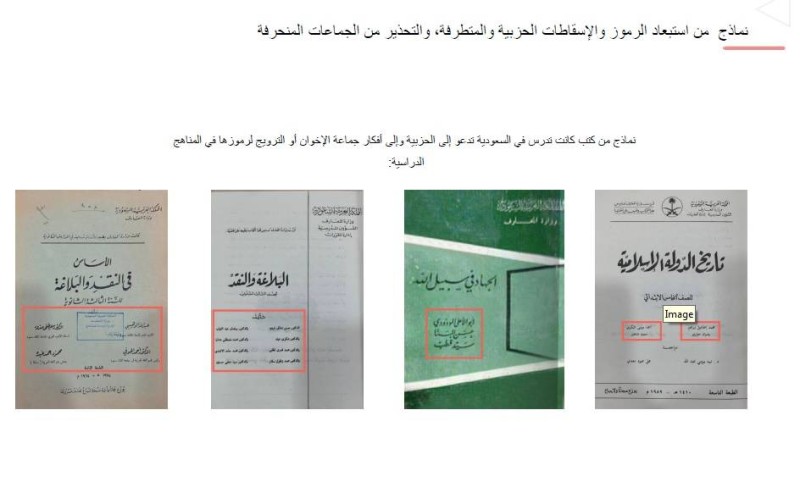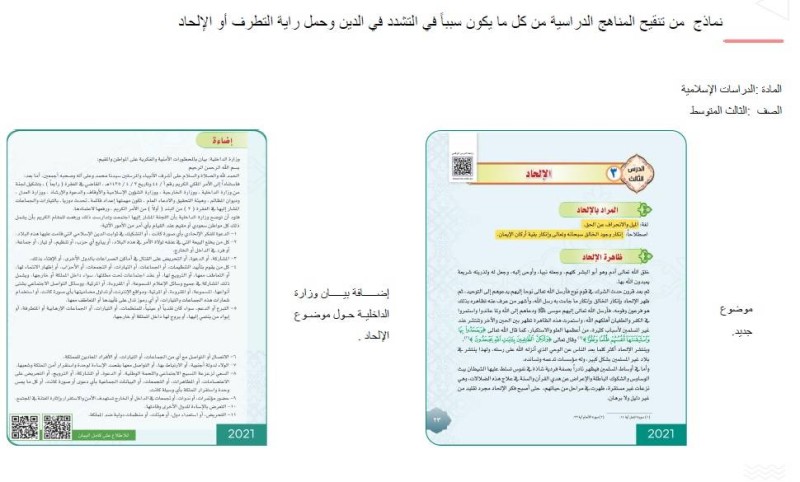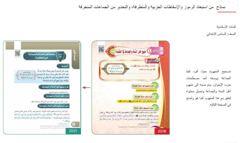 ونؤكد على أن ما ورد في هذا التقرير لا يحيط بكل عمليات التطوير لجميع المناهج الدراسية التي قام بها المختصون، وإنما يقدم هذا التقرير نماذج لإعطاء فكرة لأهم الملامح الرئيسية عن التغييرات والتعديلات التي بلغت ما يزيد على 200.000 تعديل، وفي هذ الإطار تم عرض نماذج من تضمين نصوص عن ملوك المملكة العربية السعودية والقيادات والرموز الوطنية، ونماذج من تصحيح المفاهيم، وتأكيد حقوق ولي الأمر (خادم الحرمين الشريفين)، وتعزيز الانتماء الوطني، وتطوير المادة العلمية للمناهج الدراسية وتعزيزها بالمهارات العلمية ودعمها بالتطبيقات.