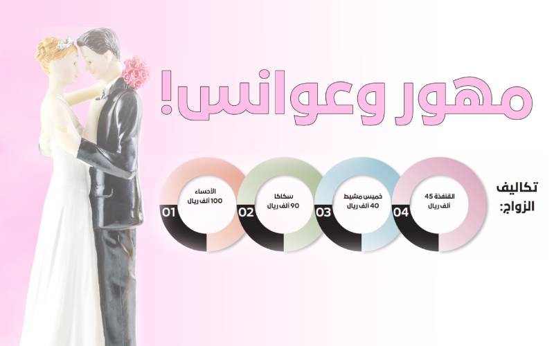 أضحت تكاليف الزواج المرتفعة في مختلف البلدان، ومنها المملكة، تشكل عبئاً كبيراً على الشباب المقبلين على الزواج لا سيما أصحاب الدخل المحدود. وباتت متطلبات الزواج حملاً ثقيلاً يجعل الكثير من المقبلين على الزواج يعزفون عن فكرة الارتباط، لعدم مقدرتهم على تلبية المتطلبات، ولأن أعباء الزواج أكثر إرهاقاً مما كانوا يعتقدون. وتعد مشكلة غلاء المهور وارتفاع تكاليف الزواج من أخطر المشاكل التي يعاني منها الشباب على وجه الخصوص، وتؤدي إلى إحجام أو تأخر سنّ الزواج للجنسين على حد سواء. وكشفت إحصائية صدرت العام الماضي، عن تكاليف الزواج في المملكة، طبقاً للمناطق، أن منطقة حائل أقل المناطق في تكاليف الزواج، وبحسب عينة من المأذونين الشرعيين، تصدرت مدينة الأحساء بالمنطقة الشرقية، أعلى المناطق في تكاليف الزواج وبلغت 100 ألف ريال، تلتها سكاكا (90 ألف ريال)، وأقل المحافظات في التكاليف هي خميس مشيط (40 ألف ريال) تليها محافظة القنفذة (45 ألف ريال).