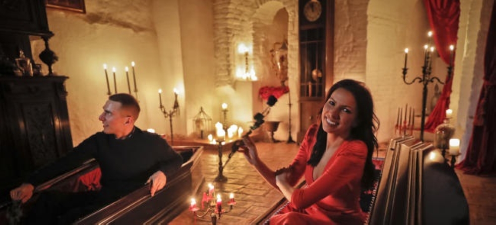 جرب روبن فارما وشقيقته تامي مع غروب الشمس حجم التابوتين اللذين سيقضيان فيهما ليلتهما في قصر دراكولا في ترانسلفانيا قبل أن يتناولا طعام العشاء.
