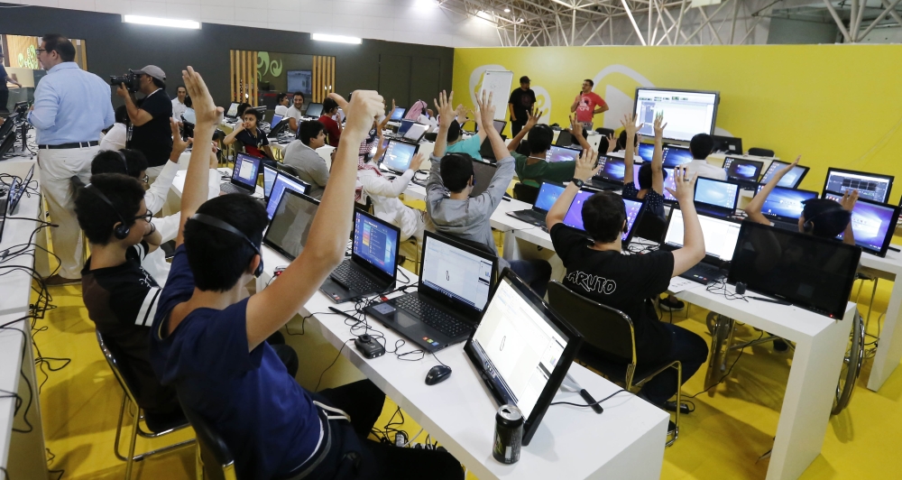 شباب يتدربون على مبادئ الإنتاج المرئي في حكايا مسك في الرياض أخيراً.