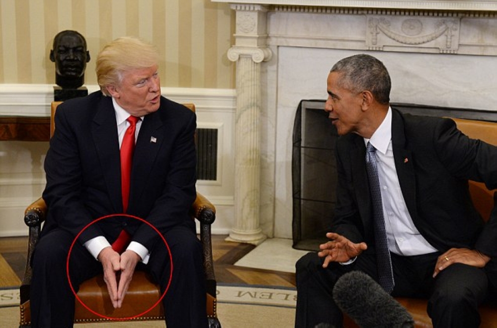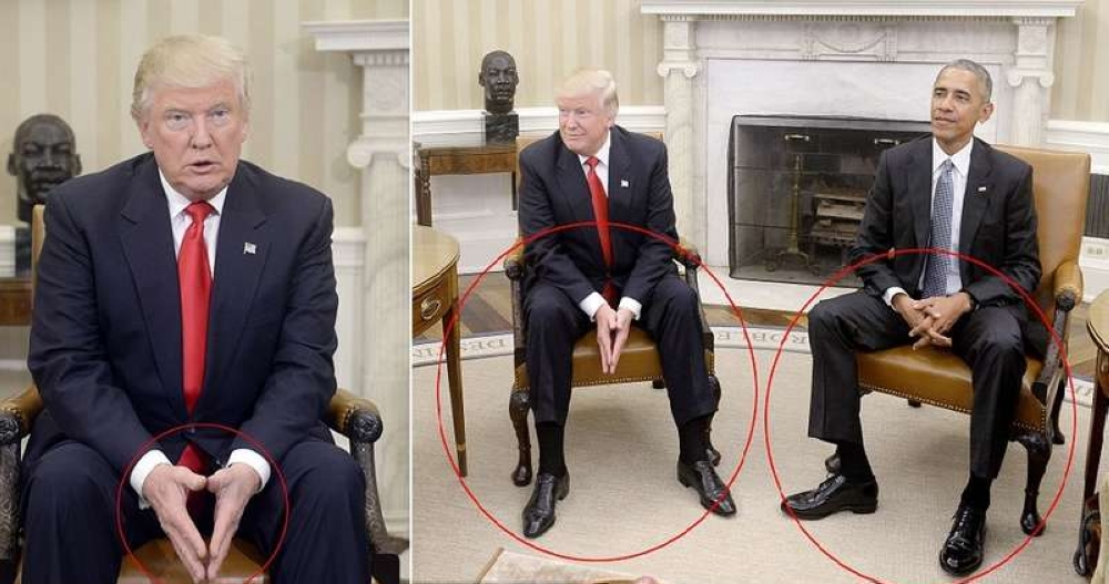 وأوضحت، أن أوباما وترامب اتخذا وضعاً ذكورياً في الجلوس يدل على التباهي والتظاهر بالقوة وهو الجلوس بساقين مفتوحتين، ملمحة إلى أن ساقي أوباما كانتا أكثر اتساعا من نظيره ترمب، وكأنه يوجه رسالة بجسده مفادها: ما زلت الرئيس حتى 20 يناير القادم.