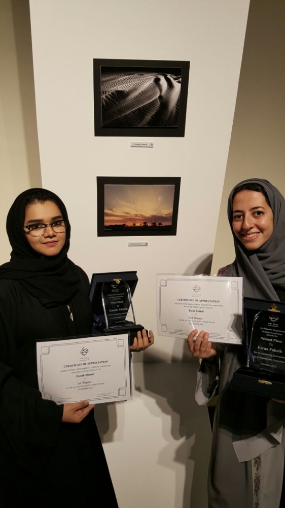 فازت الطالبة زينب أحمد بجائزة المركز الأول لمسابقة التصوير الفوتوغرافي «الضوء والظل» التي نظمتها جامعة عفت أخيرا، برعاية نائب رئيس مجلس الأمناء والمشرف العام على جامعة عفت الأميرة لولوة الفيصل، وحصد كل من الطالبات إسراء فقيه وعهد أحمد ورهف شلبي على المراكز الثلاثة التالية، وشاركت الأميرة ريم بنت محمد الفيصل في تسليمهن الجوائز في الحفلة التي أقيمت في مكتبة الجامعة والمتحف الثقافي في جدة.