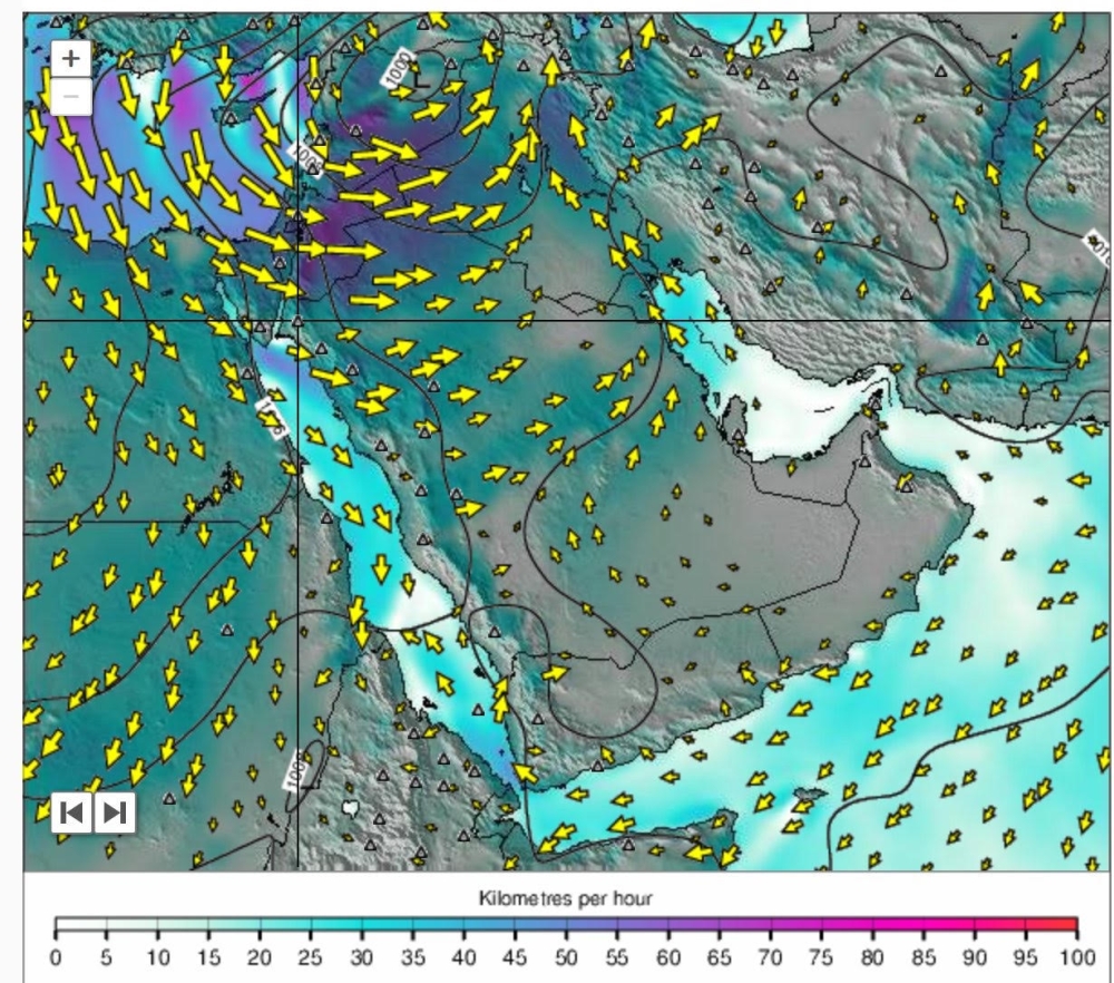 فيما يعبر منخفض جوي الشام ويتسبب بإثارة الرياح الغربية النشطة والباردة والمثيرة للغبار في "تبوك وشمال المدينة والجوف والحدود الشمالية وشمال الوسطى".