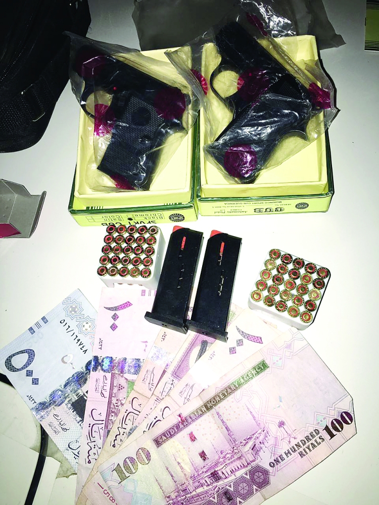 أسلحة نارية ومبالغ مالية عثر عليها بحوزة المتهم.