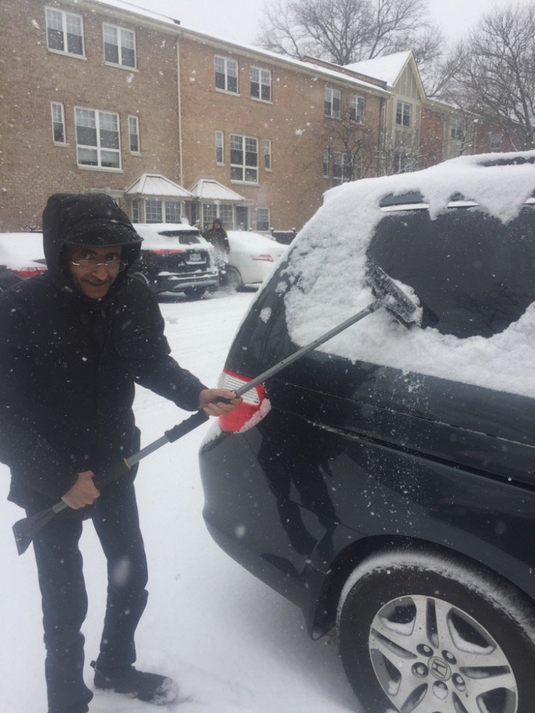 حمود أبو طالب يزيح الثلج عن نوافذ سيارته.