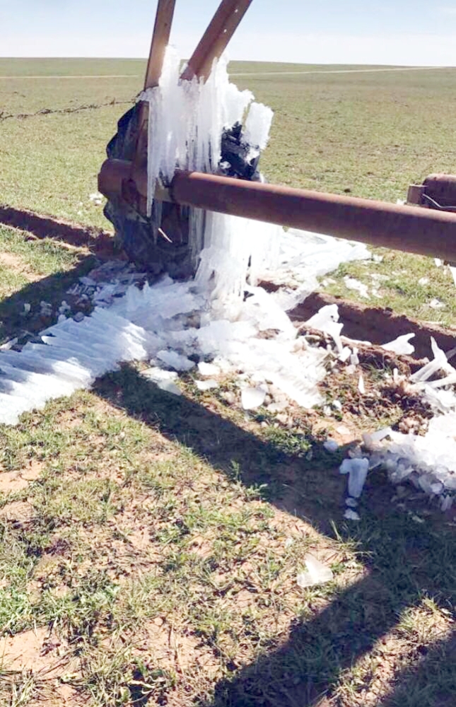 برج مائي للري الحديث تجمد تحت الصفر في مزرعة شمال حائل. (عكاظ)