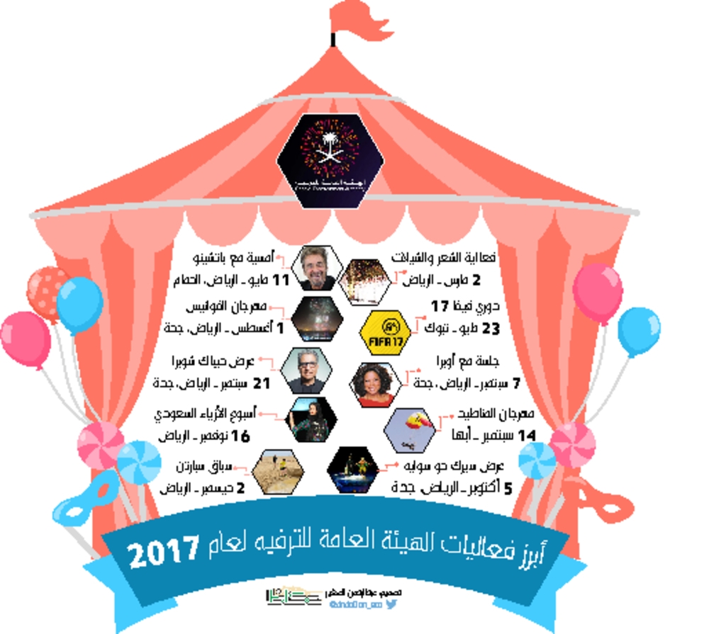 بعد أسبوع حافل بالفعاليات المنوعة التي قدمتها بالتزامن في مدن سعودية عدة، أفصحت الهيئة العامة للترفيه عن روزنامة فعالياتها لعام 2017، عبر حسابها الفاعل على تويتر «روزنامة الترفيه»، الذي يقدم تفاعلا مختلفا مع شرائح مختلفة من المتابعين بأسلوب جاذب وغير مسبوق.