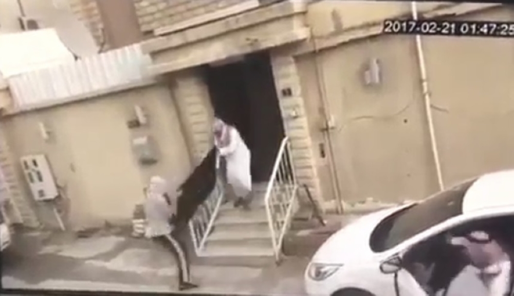 وأظهر الفيديو المتداول اللصين وهما يحملان الشاشة، وخلال خروجهما من باب المنزل تفاجأ اللصان بصاحب المنزل الذي لاحقهما وانهال عليهما بالضرب بعقاله، ليتركا الشاشة وينطلق أحدهما بمركبة صاحب المنزل محاولا الهروب، بها قبل أن يتمكن من إنزاله.