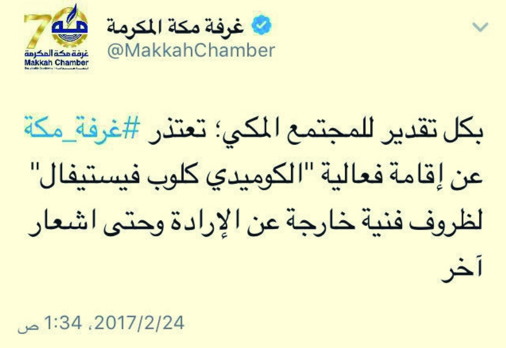ألغت غرفة مكة التجارية والصناعية فعاليات «كوميدي كلوب فيستيفال» التي كان مقررا إقامتها اليوم (السبت)، حسبما بينت في تغريدة لها على «تويتر»، قالت فيها «بكل تقدير للمجتمع المكي، تعتذر غرفة مكة عن إقامة فعاليات الكوميدي كلوب فيستيفال لظروف فنية خارجة عن الإرادة حتى إشعار آخر».