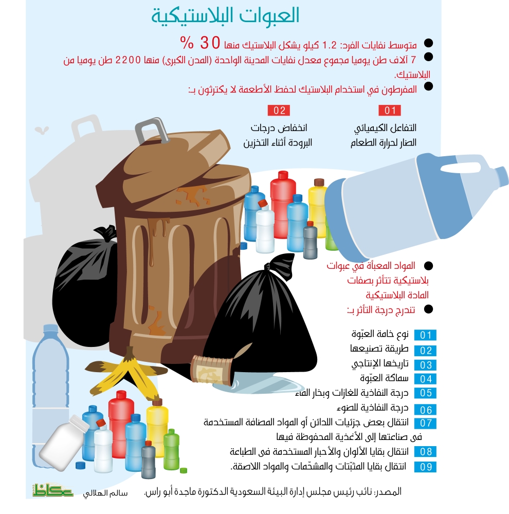 وتقول أبو راس أستاذ علم التقنيات الحيوية للملوثات البيئية إن المفرطين في استخدام الأكياس والعبوات البلاستيكية غير مكترثين بالتفاعل الكيميائي الضار لحرارة الطعام أو انخفاض درجات البرودة أثناء تخزين الأطعمة في الفريزرات مع اللدائن البلاستيكية. وأكدت ثبوت تأثر المواد المعبأة في عبوات بلاستيكية بصفات المادة البلاستيكية، وتندرج درجة التأثر بنوع خامة العبوة، طريقة تصنيعها، تاريخها الإنتاجى، سماكة العبوة، درجة النفاذية للغازات وبخار الماء، درجة النفاذية للضوء، انتقال بعض جزيئات اللدائن أو المواد المضافة المستخدمة فى صناعتها إلى الأغذية المحفوظة فيها، وانتقال بقايا الألوان والأحبار المستخدمة فى الطباعة، وبقايا المثبّتات والمشحّمات والمواد اللاصقة. وأشارت إلى دراسة هذه العوامل في تلوث محتويات العبوة التي انتهت إلى تحديد كمية مسموح بها دولياً، مضيفة «ولنعلم أن العبوات الحافظة البلاستيكية عبارة عن مركبات كيميائية قابلة للاتحاد مع غيرها أو التحلل أو التفكك الكيميائى بفعل الحرارة أو الرطوبة أو الغازات، فإذا تسربت إحدى المواد المشار إليها فى مكونات البلاستيك إلى داخل العبوة فإن هذه المواد تذوب فى الغذاء، ويحصل تحول كيميائى أو بيولوجى لمحتويات العبوة يكون أحد الأسباب الرئيسية للإصابة بالأمراض الخبيثة لا قدر الله، حيث إن تكرار استخدام العبوات البلاستيكية يؤدي إلى وجود متبقيات من مادة البلاستيك فى دمّ الإنسان التي تعد من المسببات لأخطر الأمراض».