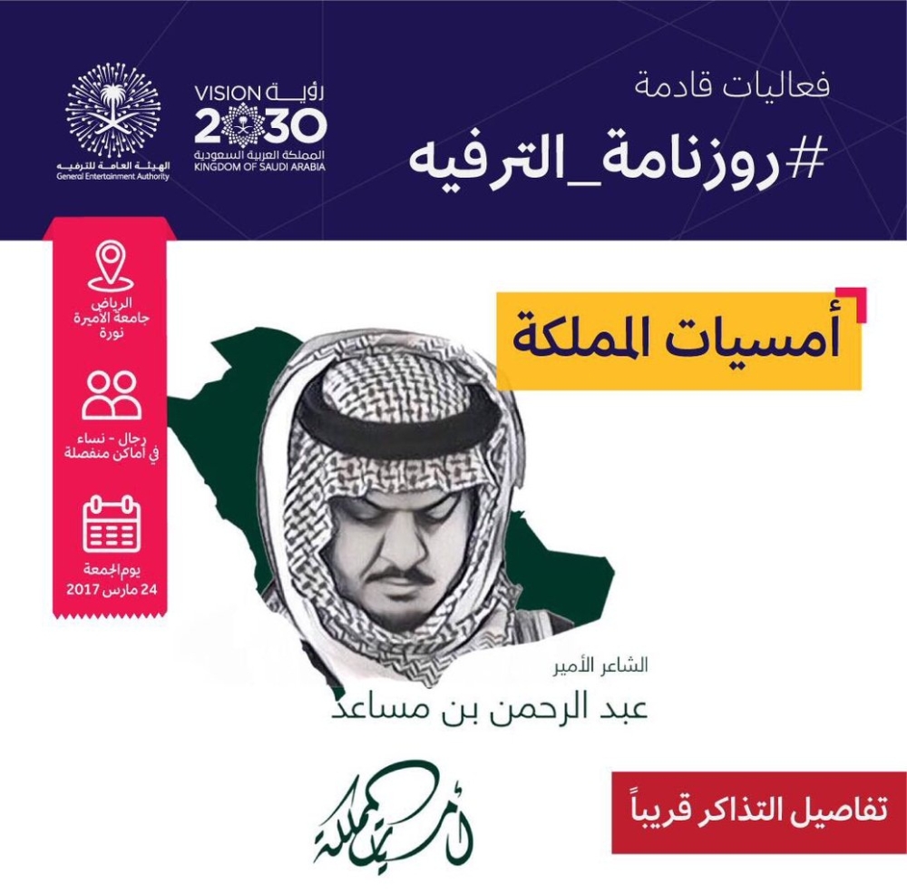 وأوضحت الهيئة أنه طبقًا لفعاليات روزنامة الترفيه فقد تم تحديد موعد الأمسية الشعرية للأمير عبدالرحمن بن مساعد، والتي عنونتها بعبارة " الشعر في ضيافة شبيه الريح" يوم الجمعة 24 /3 /2017.