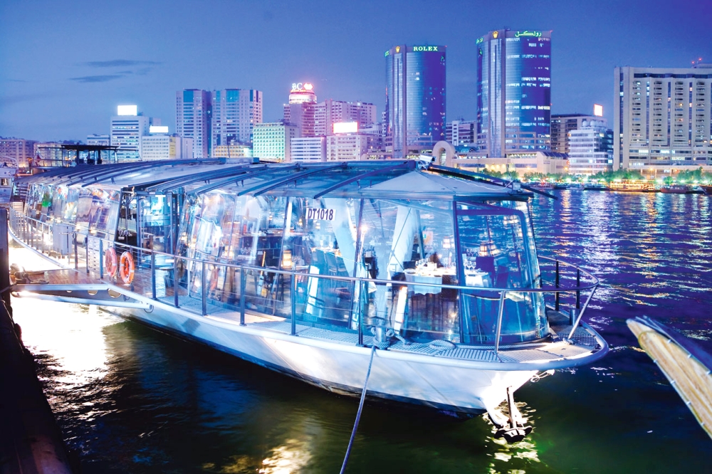 مطعم عائم على متن سفينة كليوباترا خلال رحلة بحرية ممتعة، يقدم عشاء كونتننتال، يتميز بإطلالة مميزة على منطقة تراث دبى القديمة، والمناطق البانورامية لدبي الجديدة وأبراجها الشاهقة.