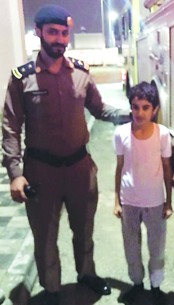 الطفل يوسف مع أحد منسوبي الدفاع المدني.