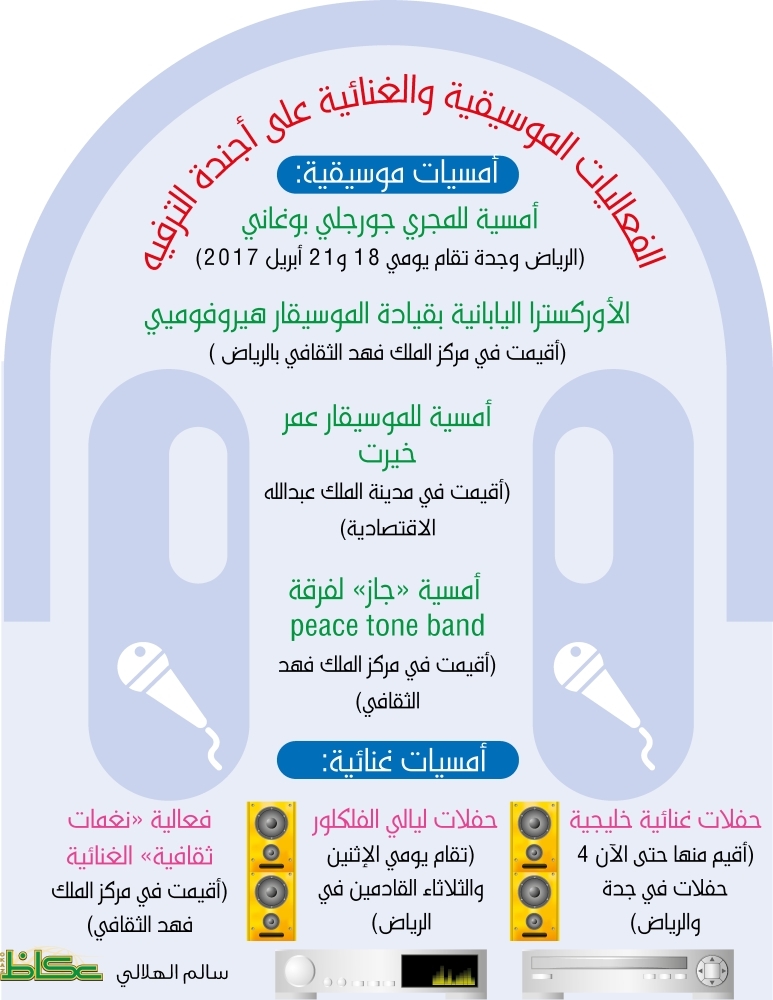 حلقت الفنون العالمية بأشكالها المتعددة وألوانها المختلفة في سماء الفعاليات الترفيهية السعودية على علو مرتفع، واتخذت في الجانب الموسيقي شكلاً أنيقاً ومختلفاً، وجد تفاعلاً جماهيرياً كبيراً يكاد أن يكون غير مسبوق، قياساً بالفترة الوجيزة التي شهدت خلال الشهور الأولى حضوراً نوعياً ومختلفاً، فبعد الأمسية الموسيقية الاستثنائية للموسيقار عمر خيرت التي نفدت تذاكرها بالكامل قبل وقت طويل من الحفلة، خطفت الأوركسترا اليابانية بقيادة الموسيقي العالمي هيروفوميي بوشيد الأضواء بتقديمها قطعاً موسيقية رائعة توجتها بتحية العائلات السعودية التي حضرت بكثافة، بعزفها السلام الملكي السعودي بمشاركة 85 موسيقيا بين عازف وكورال. وتفاعل الحضور الذي تواجد لمشاهدة الفعاليات وملأ المسرح، مع عدد من الوصلات العالمية بينها مقطوعة لموزارت قوبلت بتحية من التصفيق، وكانت الرياض وجدة قد شهدت في الشهرين الماضيين أربع حفلات غنائية لفنانين خليجيين من الوزن الثقيل، ينتظر أن تتبعها سلسلة من الحفلات في مدن أخرى. موسيقياً تتحضر جدة والرياض لمزيد من الفعاليات المميزة بحضور العازف المجري جورجلي بوغاني، المصنف على أنه أصغر عازف بيانو حاصل على جائزة كوسوث العالمية، في ليلة موسيقية جديدة يومي الثلاثاء والجمعة القادمين، فيما يدور الحديث عن مفاوضات لحضور العازف العالمي ياني والعربي نصير شمة ووصلات موسيقية لعازفين محليين. كما ينتظر أن تلقي الموسيقى التعبيرية والسينمائية بظلالها على أمسية المسرحي والسينمائي العالمي «باتشينو» الحائز على جوائز عالمية، التي يلقي فيها الضوء على أسرار نجاح مسيرته الفنية الطويلة خلف اﻟﻜﻮاﻟﯿﺲ وأﻣﺎم اﻟﻜﺎﻣﯿﺮات ﻓﻲ ﻋﺎﻟﻢ اﻟﻤﺴﺮح واﻟﺴﯿﻨﻤﺎ. وتعكف جمعية الثقافة والفنون على تنظيم سلسلة من الامسيات الغنائية في غضون الشهرين القادمين، عبر تخت شرقي ووصلات موسيقية متنوعة وأمسيات نقدية ودورات متخصصة في الموسيقى والغناء.