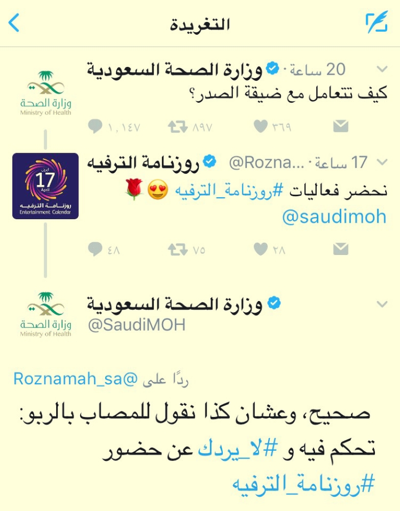 أثار سجال تويتري بين حسابي وزارة الصحة و«روزنامة الترفيه» الموثقين على الموقع الشهير «تويتر»، ردود فعل متابينة بين مغردين إنقسموا على تعاطي الجهتين الحكوميتين مع بعضهما عبر ثلاث تغريدات، إذ نشرت "الصحة" تغريدة جاء فيها «كيف تتعامل مع ضيقة الصدر؟»، أتبعتها فيما بعد بسلسلة من التغريدات التوعوية حول «الربو» وبعض الأمراض الصدرية، قبل أن تتلقى تعليقاً من حساب «روزنامة الترفيه» أثار رد الوزارة عليه موجة من التعليقات، بعد أن تضمن رداً بدا محرجاً وطريفاً على السؤال في تغريدة فحواها «نحضر فعاليات #روزنامة_الترفيه»، ليتفاعل معه حساب الصحة برد قال جاء فيه «صحيح، وعشان كذا نقول للمصاب بالربو: تحكم فيه و#لا_يردك عن حضور #روزنامة_الترفيه». وهو ما رأى فيه بعض المتابعبن غير مناسب أو مألوف لقطاعين رسميين، لاسيما «الصحة»، الذي برأيهم يفترض أن يكون أكثر جدية في التواصل مع الناس، غير أن معارضين رأوا أنها لغة بسيطة تصل بشكل سريع ويمكن أن تخدم الهدف.