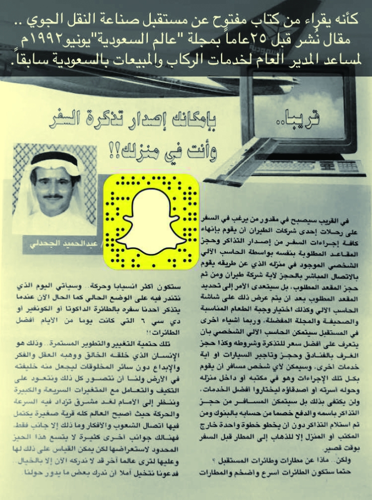 وقال مساعد المدير العام لخدمات الركاب والمبيعات الجوية بالخطوط السعودية سابقاً عبدالحميد الجحدلي لـ«عكاظ» إن مقالته المنشورة في يونيو 1992 بمجلة عالم السعودية، بعنوان «بإمكانك إصدار تذكرة السفر وأنت في منزلك»، لم تكن تقرأ مستقبل الصناعة فحسب، بل جسدت وضع الصناعة الحالي كما هو حاصل اليوم، دون رتوش أو «فلترة»، وأماطت اللثام عن إجراءات بدت غريبة في تلك الأيام، إذ إن تناول مستقبل صناعة ما آنذاك، والتحدث بمنتهى الشفافية والتطلع، كان أشبه بـ«ضرب من الخيال».حجز تذكرة السفر من المنزل وإصدارها، واختيار المقعد ووجبة الطعام ونوع الطائرة، وحجز الفنادق والسيارات، تنبؤات طرحها الجحدلي في مقالته، تبدو عادية من وجهة نظر جيل اليوم، الذي ما ينفك عن أجهزته الذكية، رغم كونها في تلك الفترة كانت خيالا بعيد المنال. ما دعا مراقبين إلى التأكد من صعوبة تخيل مستقبل المعلومات وتطور العلم.
