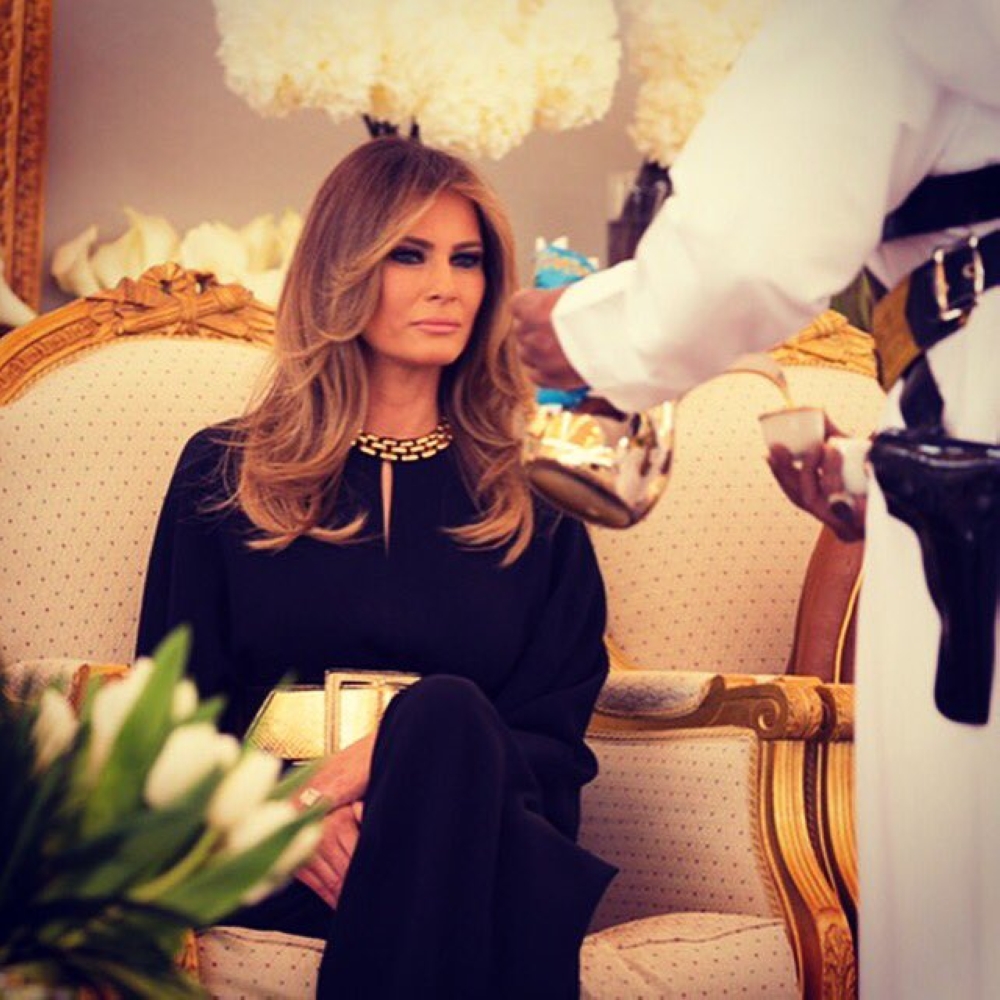 احتراما والتزاما للتقاليد السعودية، أطلت سيدة الأبيض ميلانيا ترمب من بوابة طائرة زوجها الرئيس الأمريكي التي حطت في الرياض أمس بزيها الأسود، في رمزية لاحترامها العباءة السعودية وللعادات الإسلامية، وفي أول تغريدة لها على «تويتر» عقب وصولها أعربت عن سعادتها بالحفاوة التي استقبلت بها في السعودية، وغردت على «تويتر»: «شكرا على الاستقبال الجميل»، وأرفقت بالتغريدة هاشتاق للمملكة العربية السعودية وآخر للرياض.
