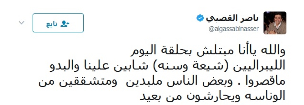 بطل العمل ناصر القصبي بعد الحلقة وجد نفسه في مواجهة جميع هذه التصنيفات وعلق ساخراً "والله يا أنا مبتلش بحلقة اليوم الليبراليين (شيعة وسنة) شابين علينا، والبدو ماقصروا .. وبعض الناس ملبدين ومتشققين من الوناسة ويحارشون من بعيد" في إشارة إلى أن الحلقة ناقشت الأمر بذات المسافة من الجميع.