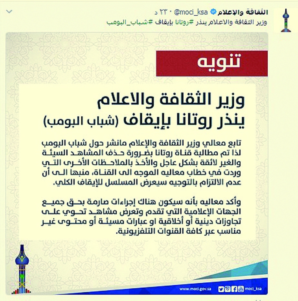 أنذر وزير الثقافة والإعلام عواد العواد، قناة روتانا بإيقاف مسلسل «شباب البومب»، إن لم تلتزم بحذف المشاهد المسيئة وغير اللائقة منه بشكل عاجل، والأخذ بالملاحظات الأخرى التي وردت في خطابه الموجه للقناة.