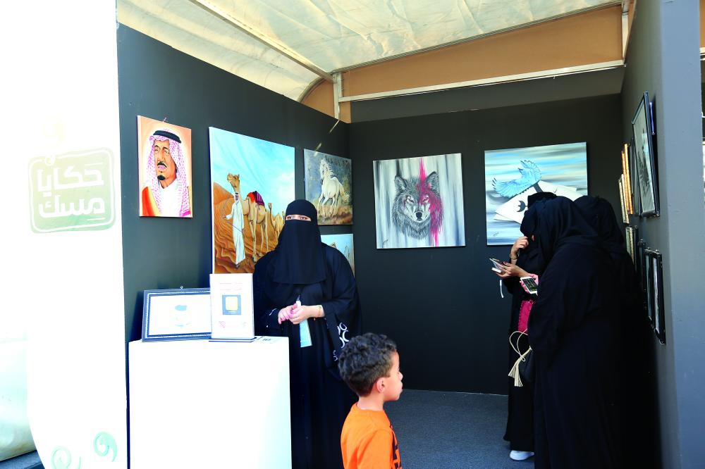 إحدى الفنانات تعرض لوحاتها الإبداعية في سوق حكايا.
