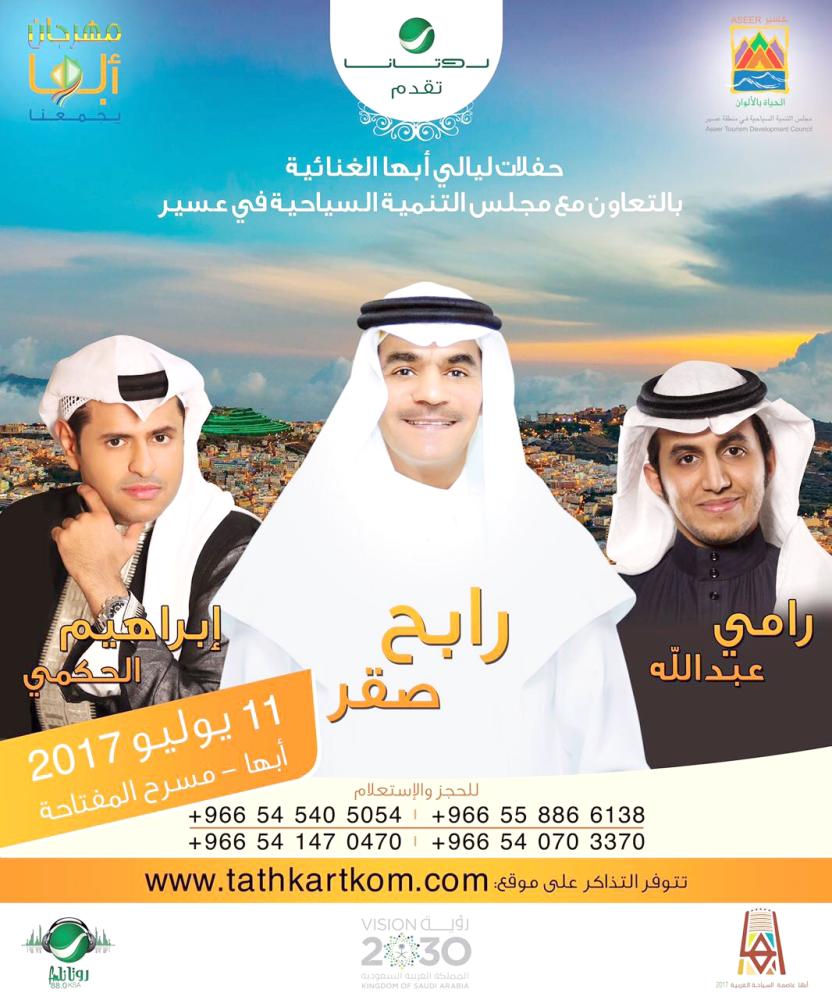 يفاجئ الفنان إبراهيم الحكمي جماهير أبها في حفلته التي من المنتظر أن يحييها بجانب صقر الأغنية الخليجية رابح صقر، والفنان رامي عبدالله، غدا (الثلاثاء)، في ثاني حفلات ليالي أبها الغنائية، ضمن مهرجان «أبها يجمعنا» المواكب لاحتفالات المدينة بلقب عاصمة السياحة العربية 2017.