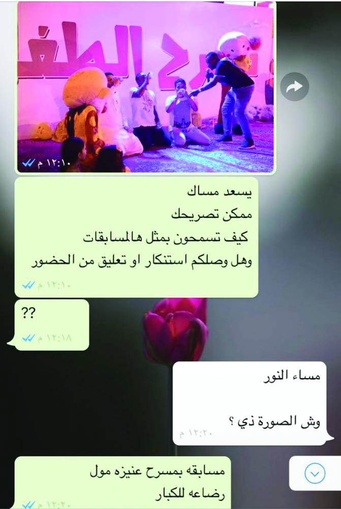 وكانت «عكاظ» بعثت استفساراً إلى الرئيس التنفيذي للمهرجان حول مسابقة «رضاعة الكبار» ضمن فعاليات مسرح الطفل لمهرجان تسوق عنيزة 38، الذي أحالنا إلى مدير المركز الإعلامي بالمهرجان، الذي بدوره عمد إلى تعقيد مهمة الصحفي، بعد رفضه تلقي أي استفسار عبر «الواتساب»، وطلبه مراسلته عبر الإيميل، ثم عاد مجدداً ورفض الإجابة دون وصول خطاب رسمي من «عكاظ»، ولم يواكب «التطور الإعلامي» الذي يمكن للصحفي من خلاله الاعتماد على مراسلات «الواتساب».