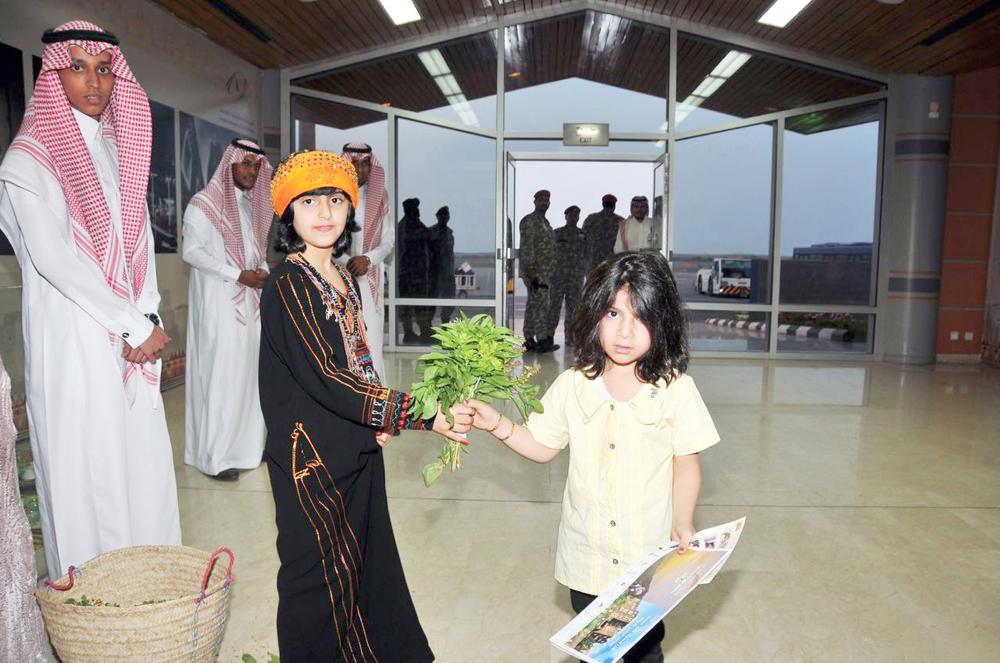 طفلة بالزي العسيري من هيئة السياحة تهدي باقة ريحان لأخرى في مطار أبها بعد وصولها أمس بصحبة أسرتها لحضور مهرجان «أبها يجمعنا». (عكاظ)