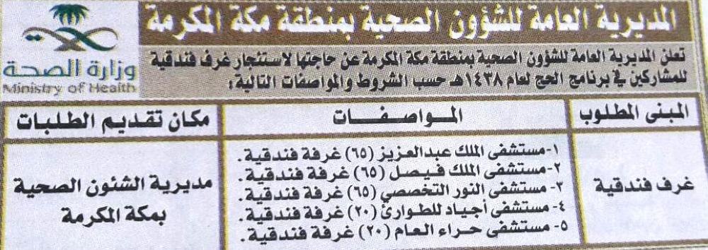 في وقت يعاني فيه الكثير من المرضى ومراجعي أقسام المستشفيات في العاصمة المقدسة من نقص الأسرة، وتباعد مواعيد العمليات الجراحية والانتظار في أقسام الطوارئ بحثا عن سرير شاغر، خرجت الشؤون الصحية في مكة المكرمة بإعلان للبحث عن 235 غرفة فندقية للمشاركين في الحج عبر منافسات بين الفنادق، وجاءت مستشفيات الملك عبدالعزيز بـ65 غرفة فندقية، مستشفى الملك فيصل بـ65 غرفة، ومستشفى النور التخصصي بـ65 غرفة ومستشفى أجياد الطوارئ ومستشفى حراء العام بعدد 40 غرفة مناصفة بينهما، ما يكلف ميزانية الصحة مبالغ كبيرة تتجاوز 3 ملايين ريال كفيلة بالارتقاء بخدمات المرضى.