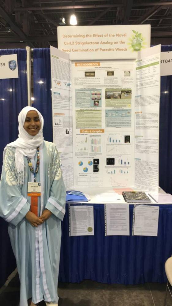 وقدمت الطالبة فاطمة الشيخ والتي تبلغ من العمر 19 عاما نبذة مختصرة عن بحثها، إذ قالت لـ "عكاظ" أن المشكلة التي يحلّها مشروعها هي الأعشاب الطفيلية الجذرية التي تسبب أضراراً جسيمة اقتصاديا واجتماعيا بتدميرها للحقول الزراعية.