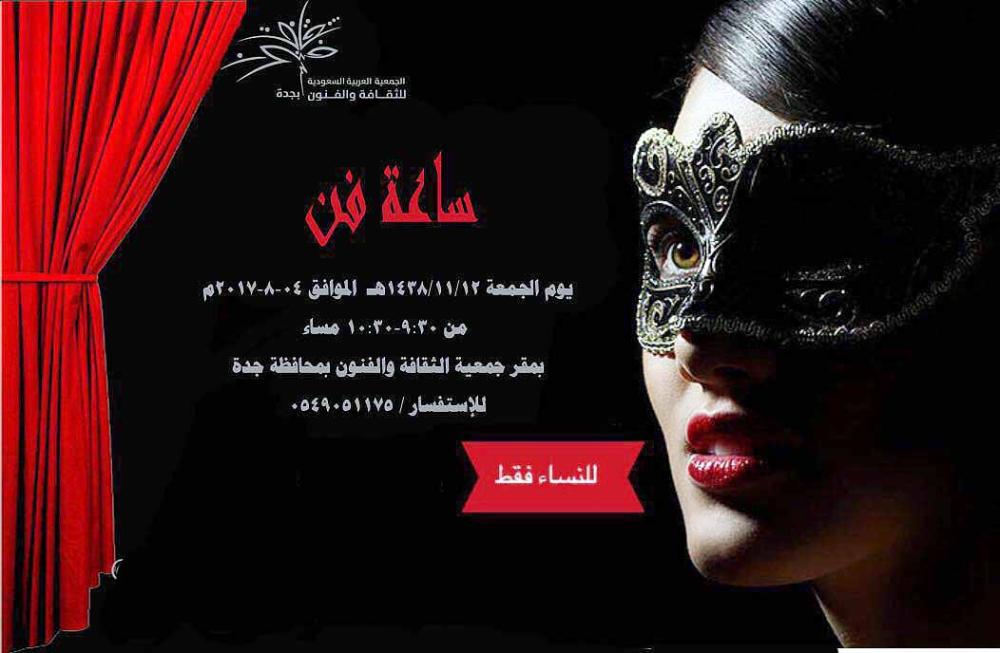 تطلق جمعية الثقافة والفنون بجدة في التاسعة والنصف مساء اليوم، ولمدة ساعة كاملة فعالية «ساعة فن»، المخصصة للنساء فقط، ضمن فعالياتها الصيفية لإبراز مواهب الفتيات. وتتضمن، فقرات غنائية، ولوحات استعراضية نسائية، وعزفا على البيانو، وستاند أب كوميدي، حسب رئيسة لجنة المسرح النسائي سامية البشري، التي أشارت إلى أن اللجنة تحرص على استقبال الموهوبات لتطوير إبداعاتهن، وإكسابهن المهارات المطلوبة.