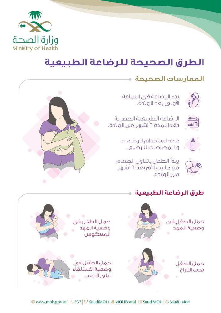 استعرضت وزارة الصحة أهمية الرضاعة الطبيعية معززة ذلك بـ«إنفوجرافيك» توعوي نشرته على حسابها في تويتر بمناسبة الأسبوع العالمي للرضاعة الطبيعية الذي يُفعّل سنوياً من 1 إلى 7 أغسطس. وتناولت النشرة الطرق الصحيحة للرضاعة الطبيعية، والممثلة في الممارسات الصحية التي تشمل بدء الرضاعة في الساعة الأولى بعد الولادة، الرضاعة الطبيعية الحصرية فقط لمدة 6 أشهر من الولادة، وعدم استخدام الرضاعات والمصاصات للرضيع، وأن يبدأ الطفل بتناول الطعام مع حليب الأم بعد 6 أشهر من الولادة.