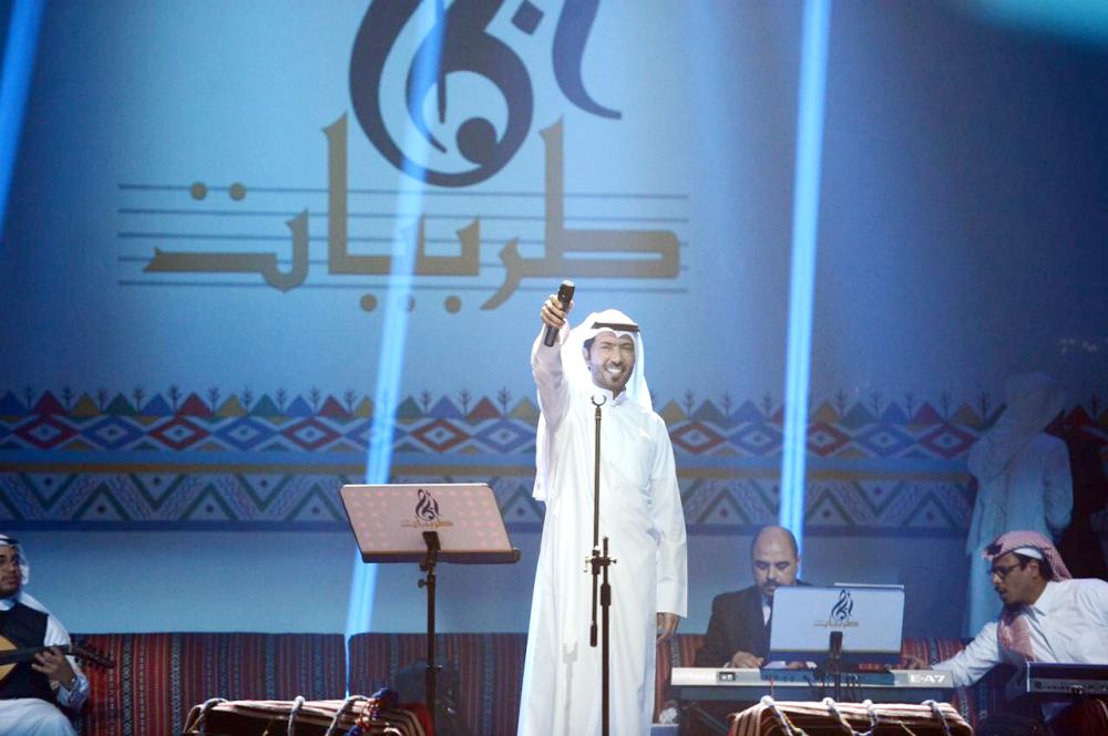 الراشد متفاعلاً مع جمهور أمسيات «طربيات» أمس الأول ومشاركته الغناء معهم. (عكاظ)