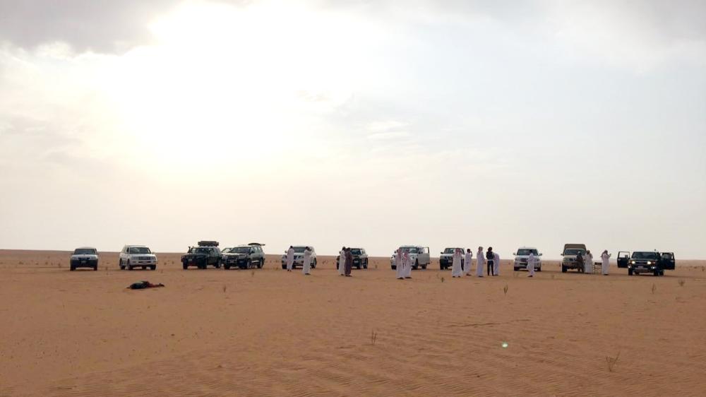 عرق الكناسية في نفود الدهناء، ويبدو فريق عون الإنقاذي بعد العثور على الجثة.