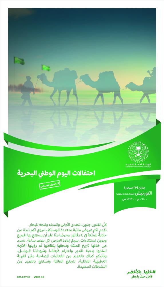تطلق الهيئة العامة للترفيه ضمن احتفالاتها باليوم الوطني فعالية "احتفالات اليوم الوطني البحرية"، وذلك يوم السبت المقبل 23 سبتمبر في الكورنيش مقابل منتزه سلوى بمنطقة جازان من الساعة 6 مساءً إلى الساعة 12:30 بعد منتصف الليل.