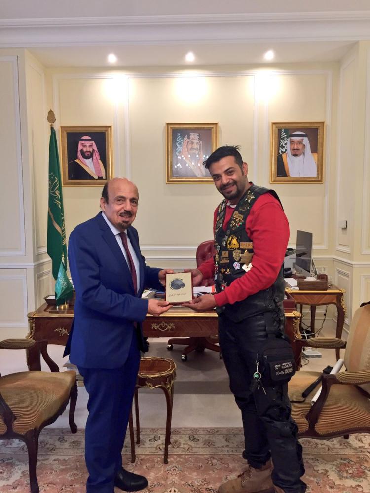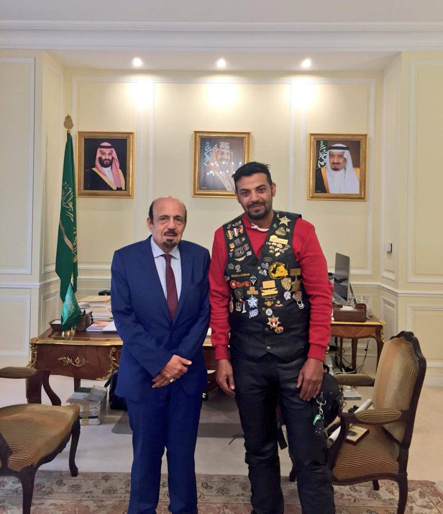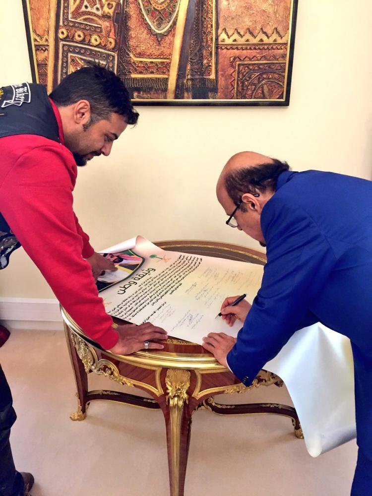 ووقع السفير خلال الاستقبال على "وثيقة وطن" التي تحمل تواقيع سفراء خادم الحرمين الشريفين في كل دولة يمر بها الرحالة الزهراني، متمنيًا له كل التوفيق في إكمال مسيرته.