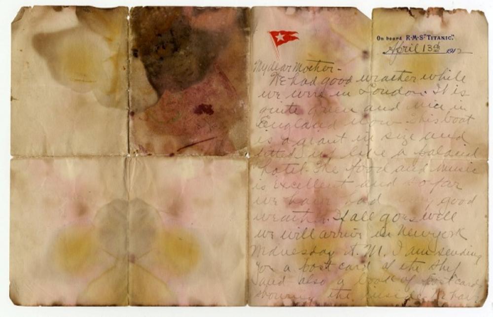 وكتب الخطاب راكب الدرجة الأولى ألكسندر أوسكار هولفرسن إلى والدته على ورقة نقش في أعلاها اسم تيتانيك ويصف في الرسالة انطباعاته عن السفينة الضخمة ويشيد بالطعام والموسيقى.