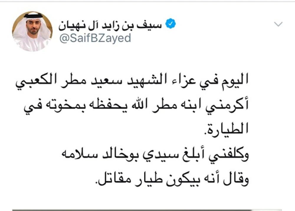 وغرد الشيخ سيف بن زايد عبر حسابه الرسمي في «تويتر»: «اليوم في عزاء الشهيد سعيد مطر الكعبي أكرمني ابنه مطر الله يحفظه بمخوته في الطيارة، وكلفني أبلغ سيدي بو خالد سلامه وقال إنه بيكون طيار مقاتل».