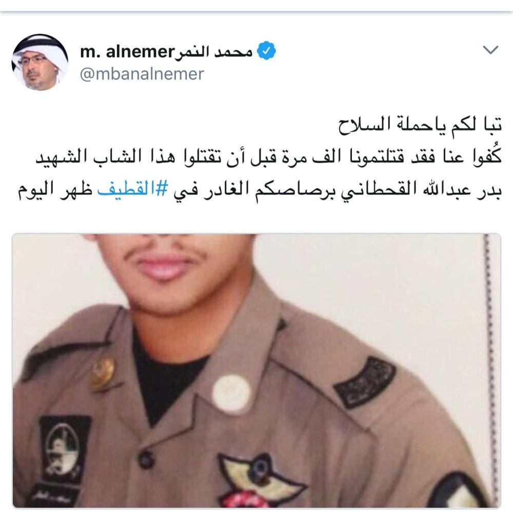 لم يصمت ابن القطيف محمد النمر عند سماعه بخبر استشهاد رجل الأمن عبدالله القحطاني ظهر (الإثنين) بالمنطقة الشرقية، إذ قال النمر صارخاً "تبا لكم يا حملة السلاح".