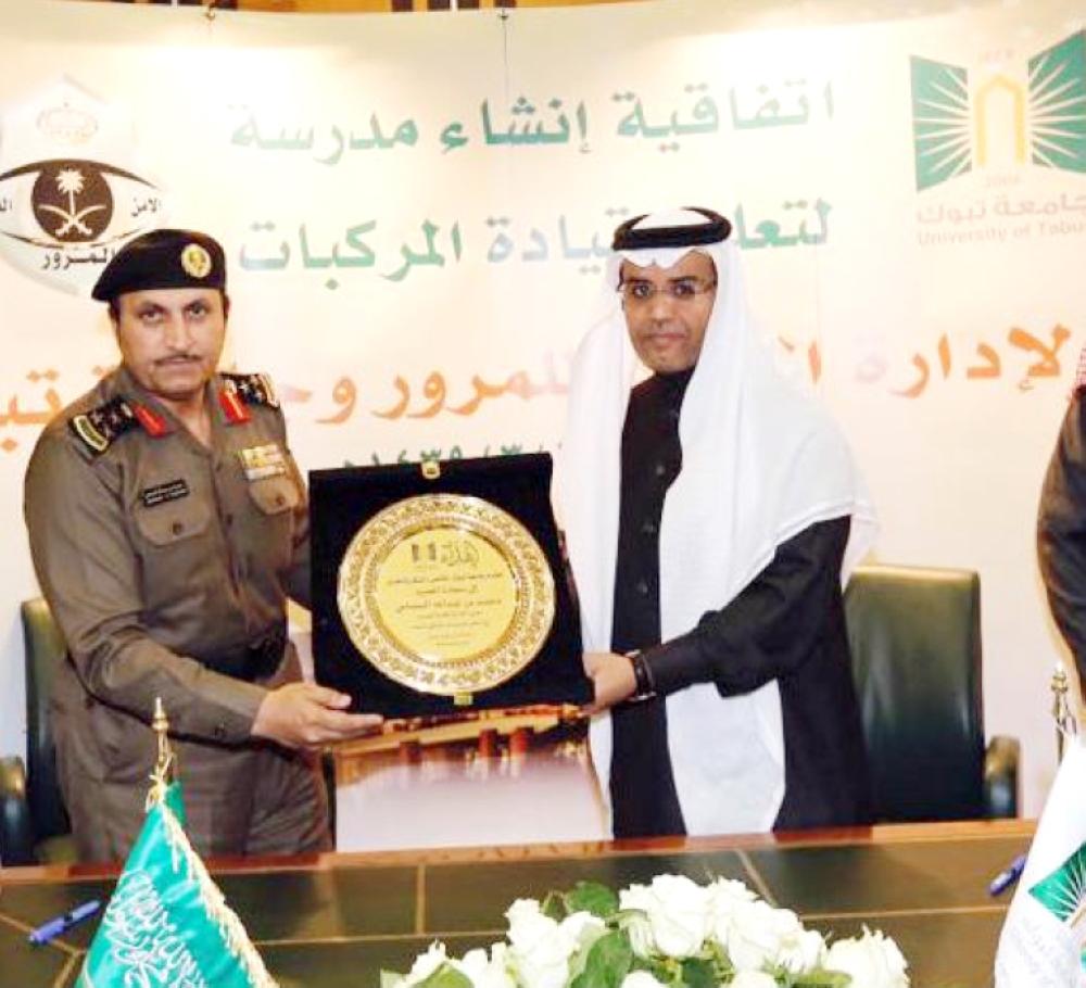 مدير المرور يتلقى تكريما من جامعة تبوك على هامش توقيع الاتفاقية. (واس)